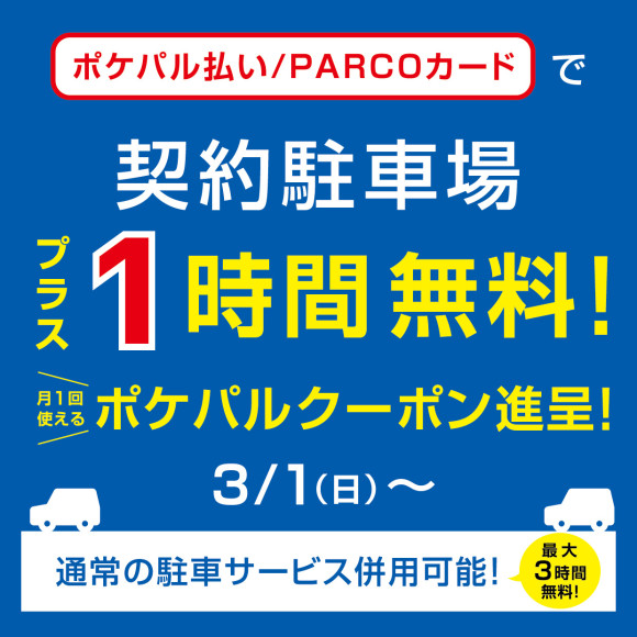 毎月1回配信!パルコ契約駐車場 駐車料金プラス1時間無料クーポン!最大3時間無料に!
