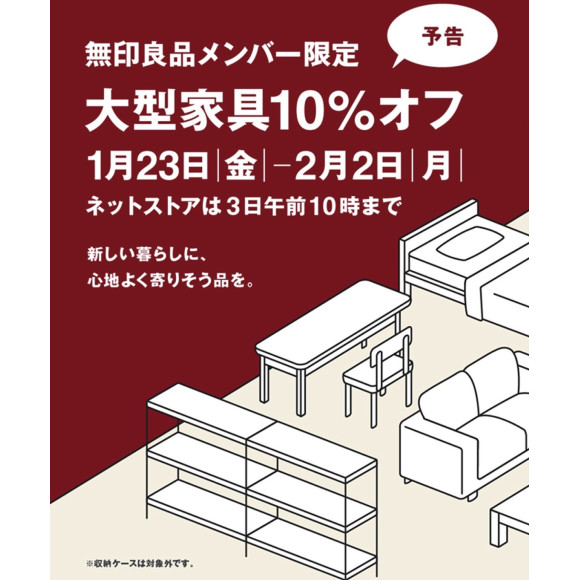 無印メンバーを対象に、対象の大型家具(一部商品を除く)が10%OFFとなるキャンペーンを1月23日(金)~2月2日(月)まで開催いたします。