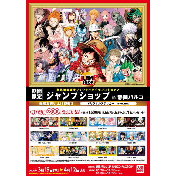 『ONE PIECE』や『SAKAMOTO DAYS』『アオのハコ』『カグラバチ』『魔男のイチ』など人気作品をはじめとした、原作イラストグッズが満載のジャンプショップが、静岡パルコに期間限定オープンいたします。