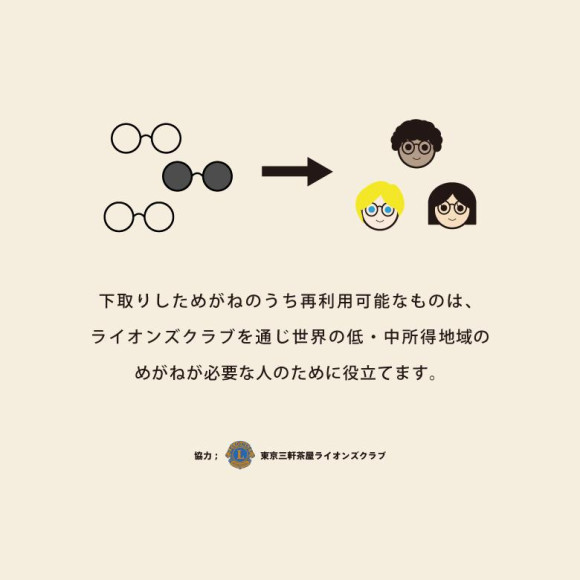 回収された眼鏡の中で再利用が可能なものは、ライオンズクラブ国際協会のリサイクルセンターにて度数ごとに仕分けられ社会奉仕団体「ライオンズクラブ国際協会」を通じて、世界の低・中所得地域の眼鏡を必要としている人のために役立てます。