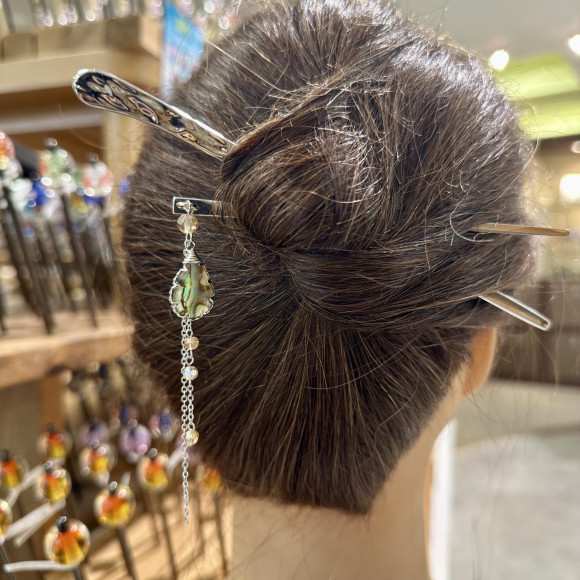 光の当たり方によって様々な表情を見せる『螺鈿』がチャームなっており、2種類の軸の色味によって印象が変わる上品な簪となっております(⸝⸝⸝´꒳`⸝⸝⸝)
