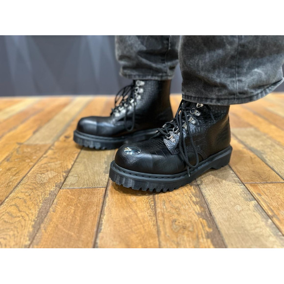 クロコ型押しのレザーと、存在感のあるディテールが融合したレースアップブーツ!