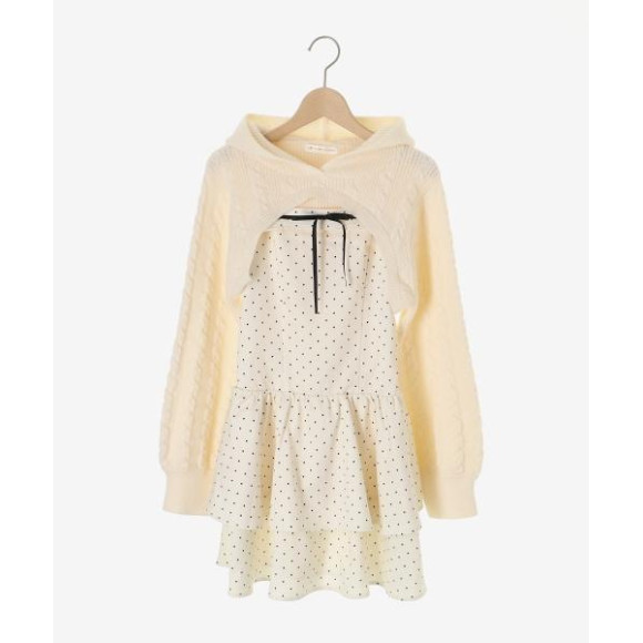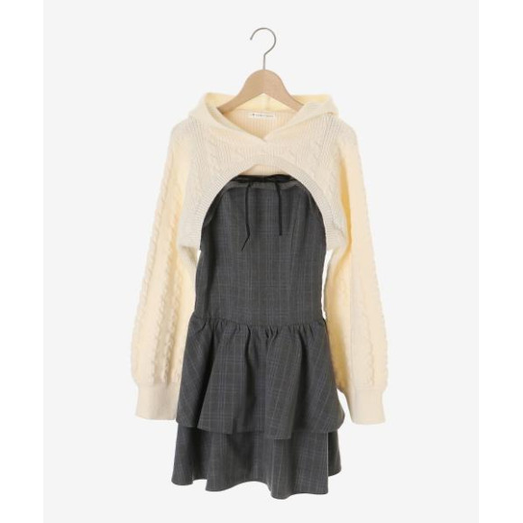 ふんわりとしたガーリーなティアードキャミワンピに、ケーブル編みのフード付きボレロがセットになったコーデセット。