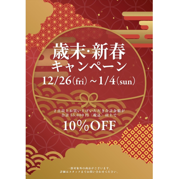 1月4日まで2点以上お買い上げいただき合計金額が¥55,000(税込)以上で