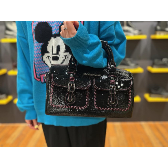 シボ感のあるダメージ加工を施したパテントレザーと、ピンクのコントラストステッチが、90sのアティチュードを感じさせるトップハンドルバッグが登場!