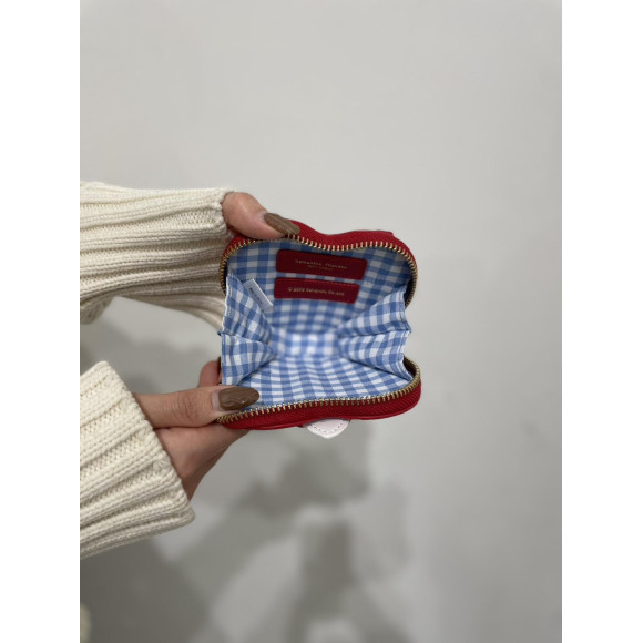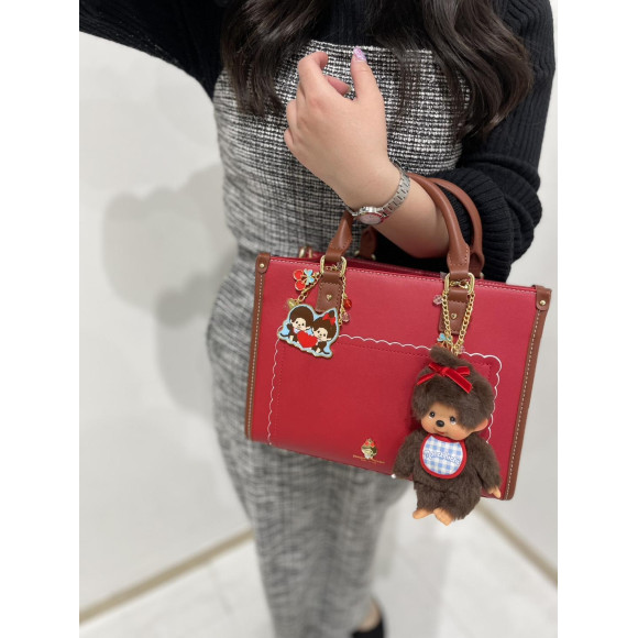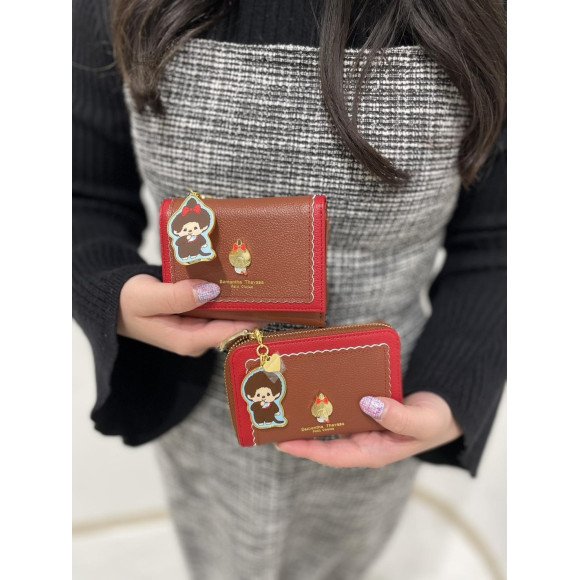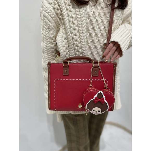 チェリーをイメージしたレッドカラーをベースに、スカラップデザインや「モンチッチちゃん」のゴールド金具を施したデザインがポイント。