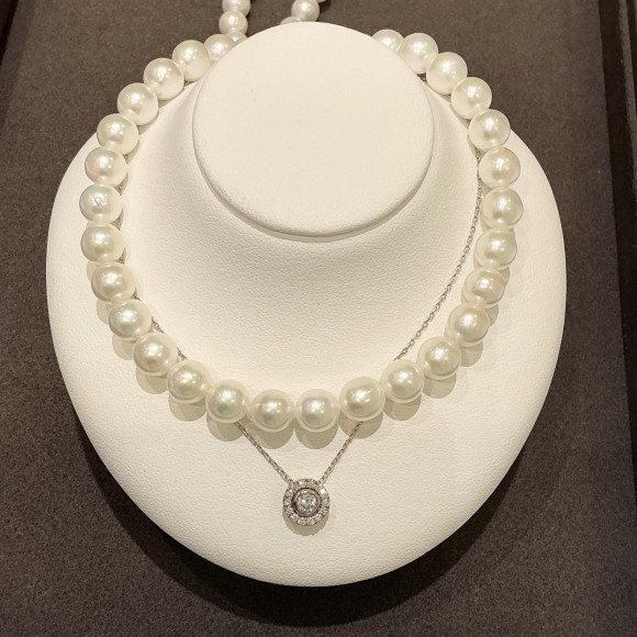 パールのネックレスとダイヤモンドネックレスをコーディネートしてフォーマルはもちろん、普段使いもおすすめです!