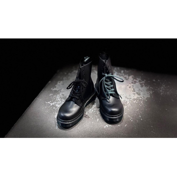 ドクターマーチン定番のブラックの光沢感あるスムースレザーにグリーンが映えます!