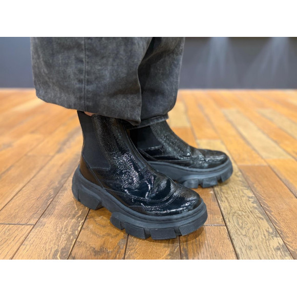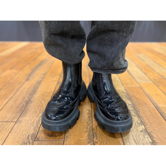 アッパーにはひび割れたような表情のディストレストパテントレザーを使用。美しい光沢のあるレザーにダメージ感のある加工を施し、シンプルなシルエットを際立たせます!