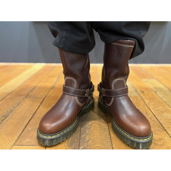 ボリュームのあるBEXソールを、アイコニックなイエローウェルトステッチで固定。ビターチョコレート×イエローのヒールループで仕上げました。無骨なバイカーブーツに、柔らかな華やかさを添えた一足です。