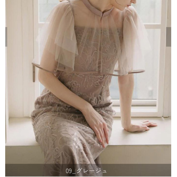 袖部分は2種類のチュールを段差を付けて重ねる事で立体感を生み、気になる二の腕や肩回りを華奢に見せてくれる効果も期待できます。