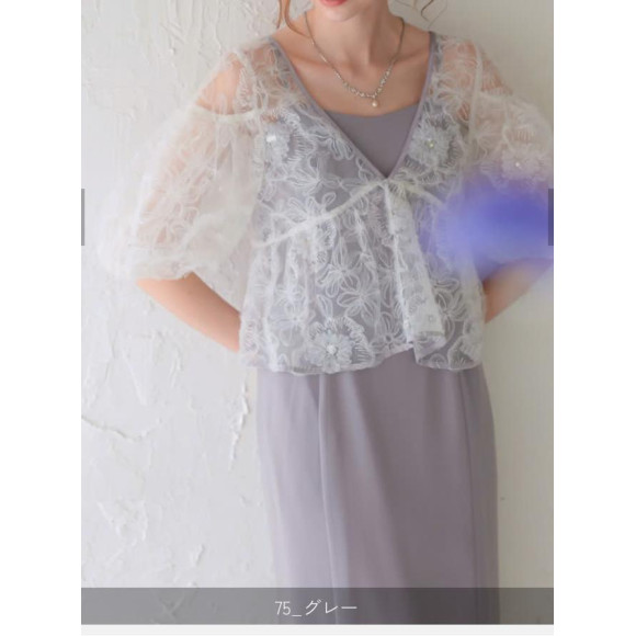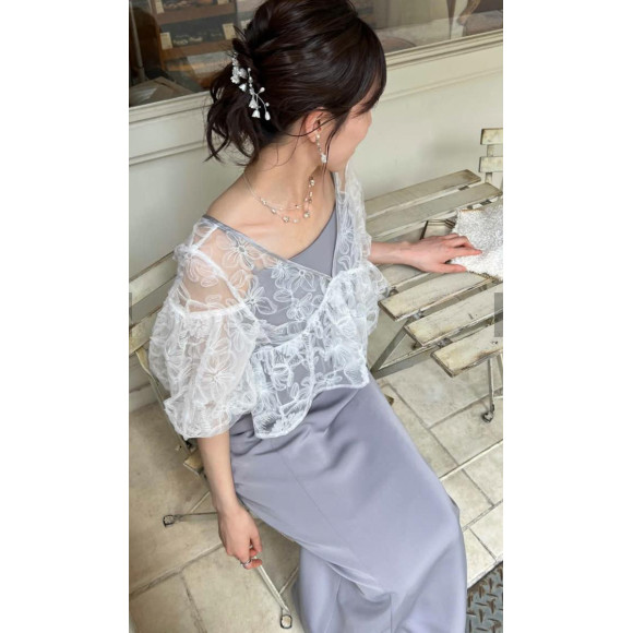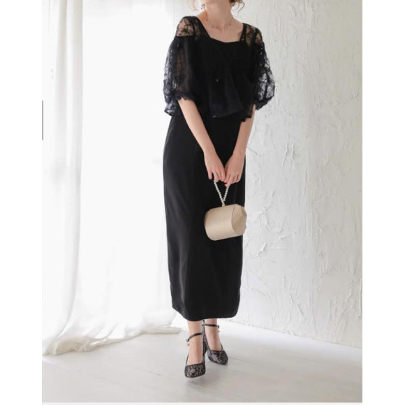 フラワーモチーフが目を惹くペプラムブラウスとキャミワンピースがセットになったドレス。